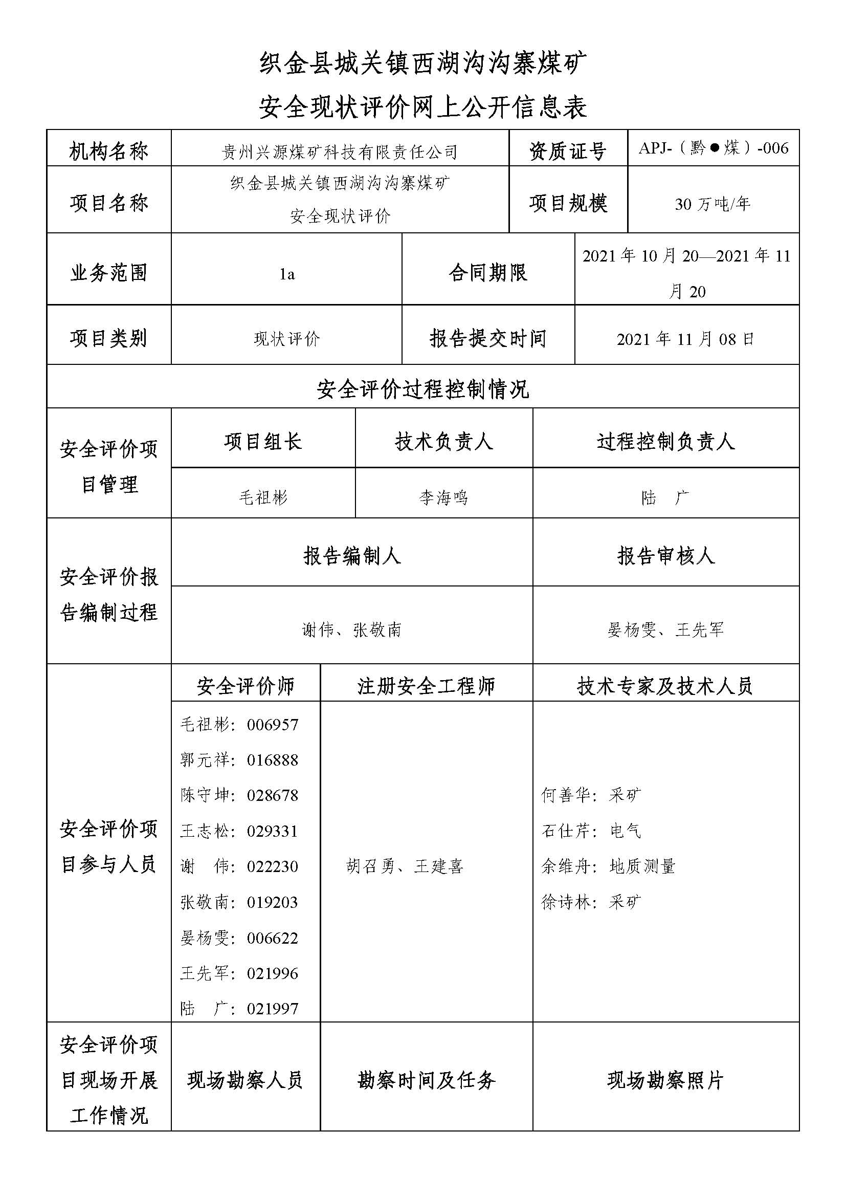 織金縣城關(guān)鎮(zhèn)西湖溝溝寨煤礦安全現(xiàn)狀評價網(wǎng)上公開信息表