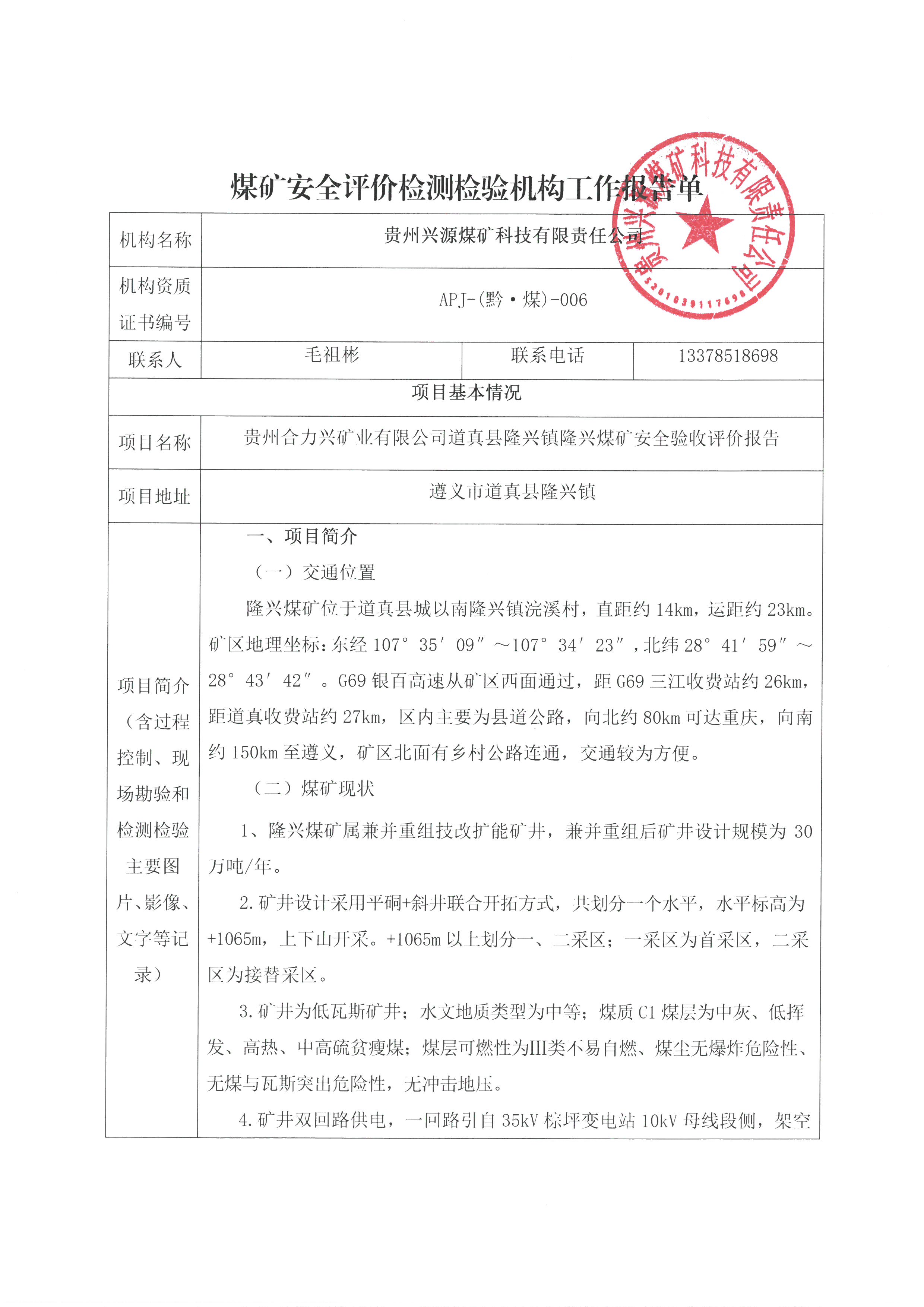 煤礦安全評價檢測檢驗機(jī)構(gòu)工作報告單【貴州合力興礦業(yè)有限公司道真縣隆興鎮(zhèn)隆興煤礦安全驗收評價報告】