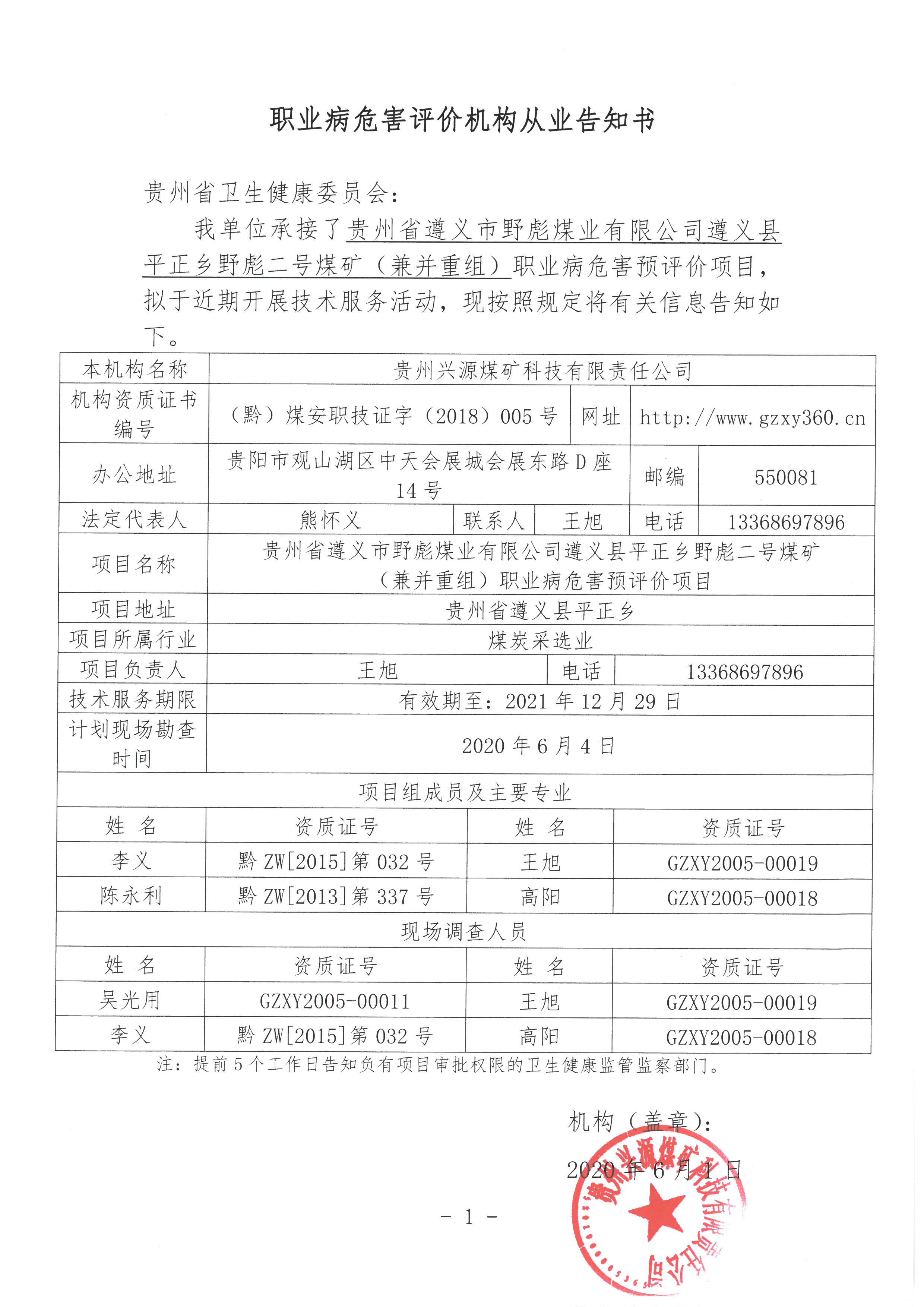 職業病危害評價機構從業告知書【貴州省遵義市野彪煤業有限公司遵義縣平正鄉野彪二號煤礦(兼并重組)】