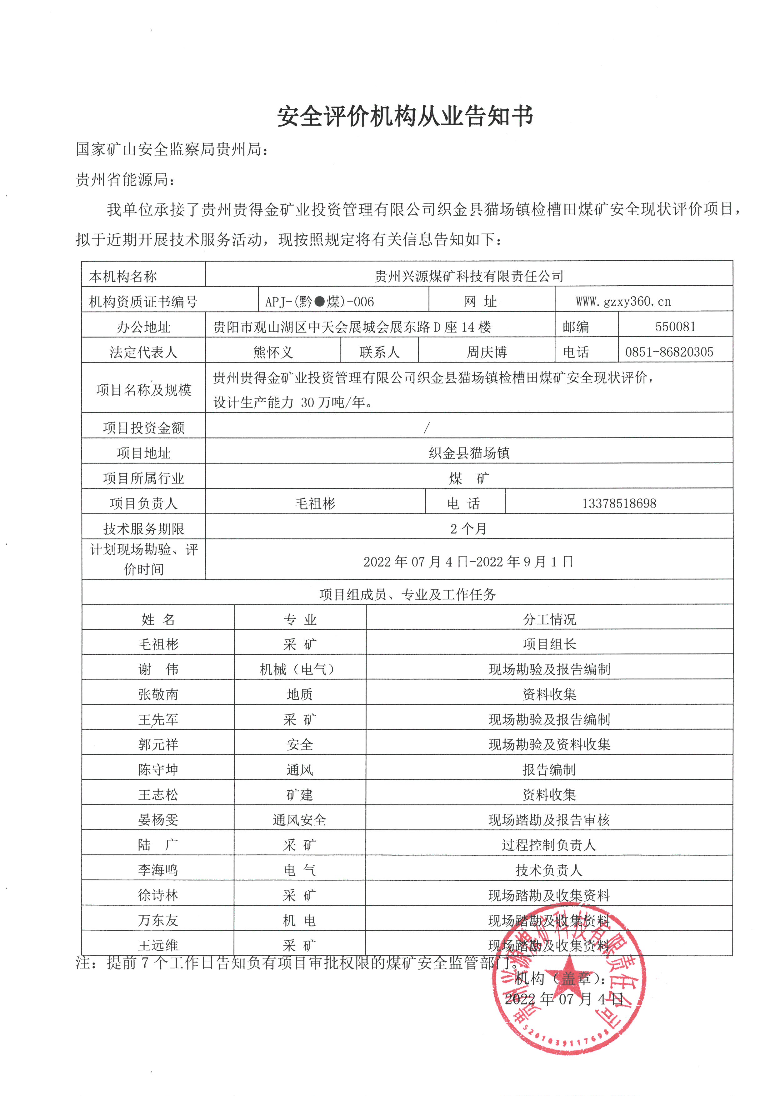 安全評價機構從業告知書【貴州貴得金礦業投資管理有限公司織金縣貓場鎮檢槽田煤礦】