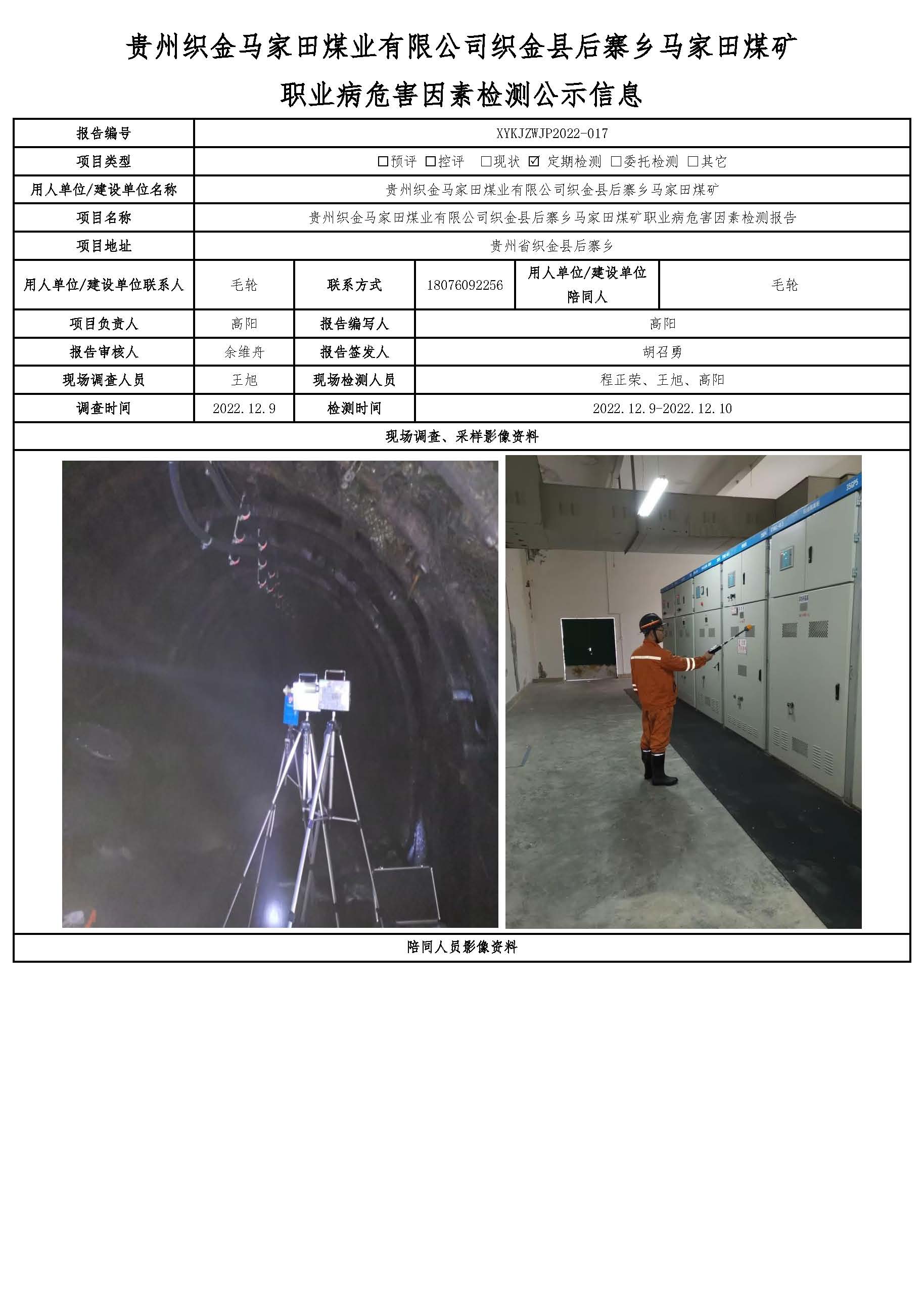 貴州織金馬家田煤業有限公司織金縣后寨鄉馬家田煤礦 職業病危害因素檢測公示信息