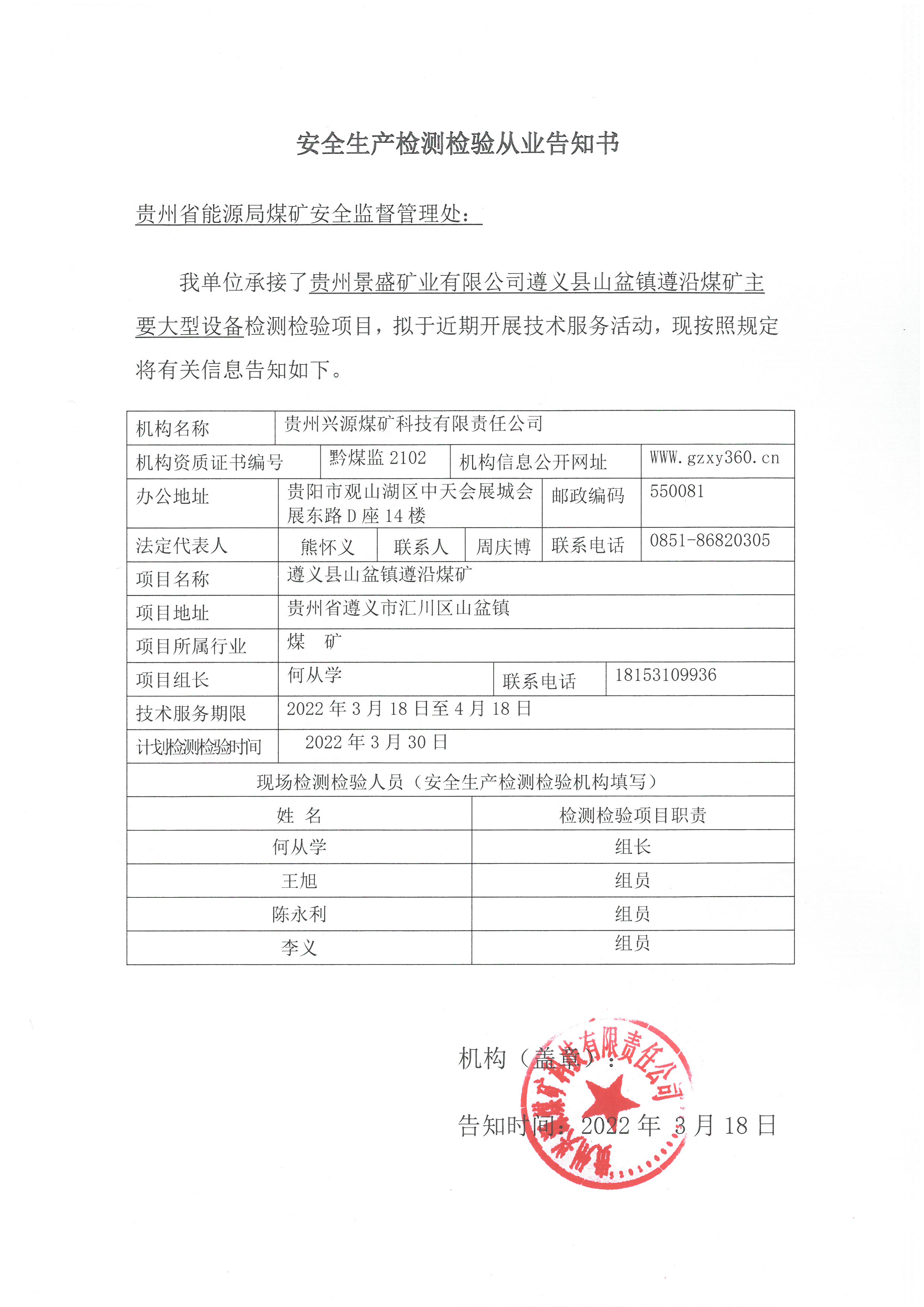 安全生產檢測檢驗從業告知書【貴州景盛礦業有限公司遵義縣山盆鎮遵沿煤礦主要大型設備檢測檢驗項目】