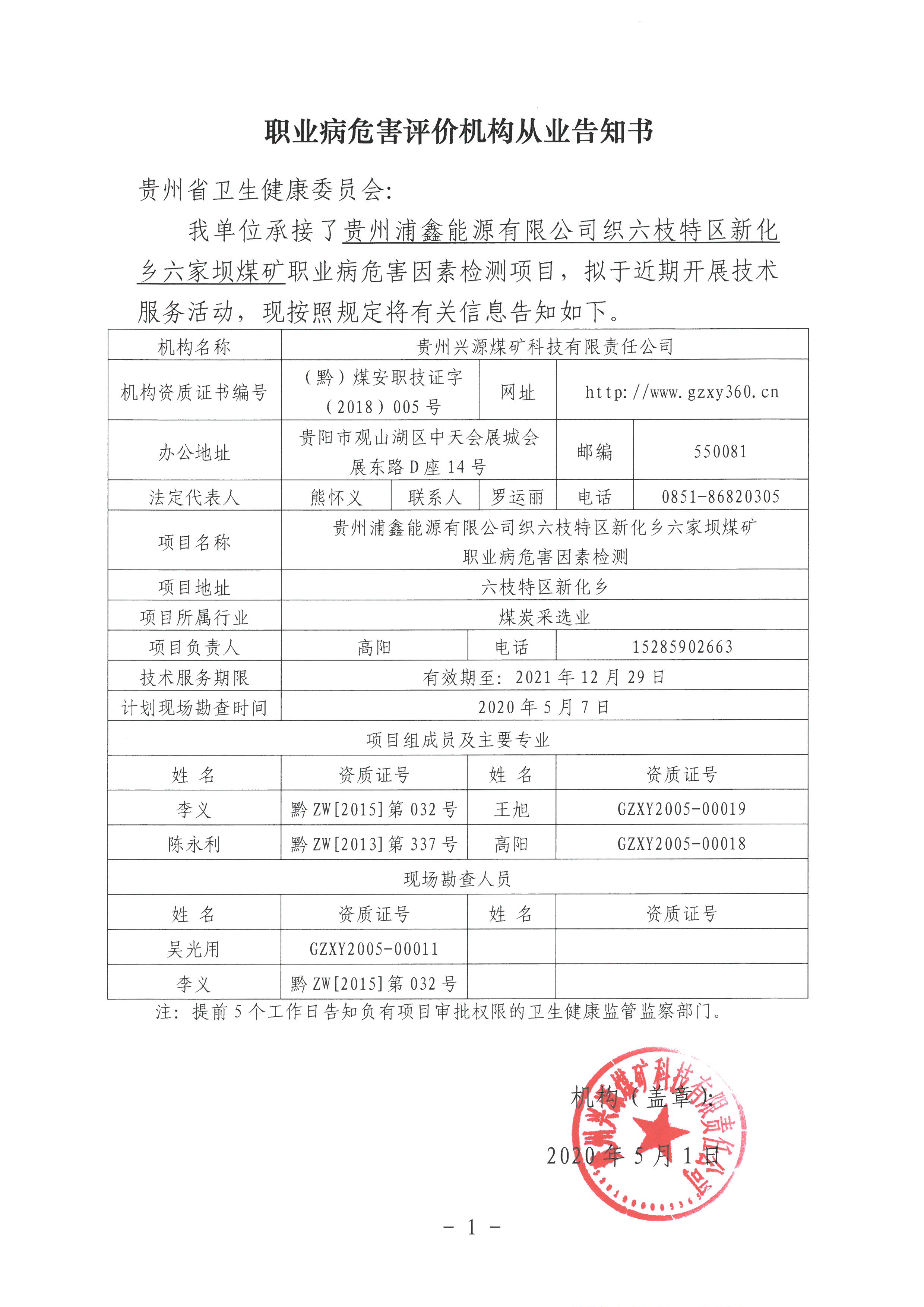 職業病危害評價機構從業告知書[貴州浦鑫能源有限公司六枝特區新華鄉六家壩煤礦]