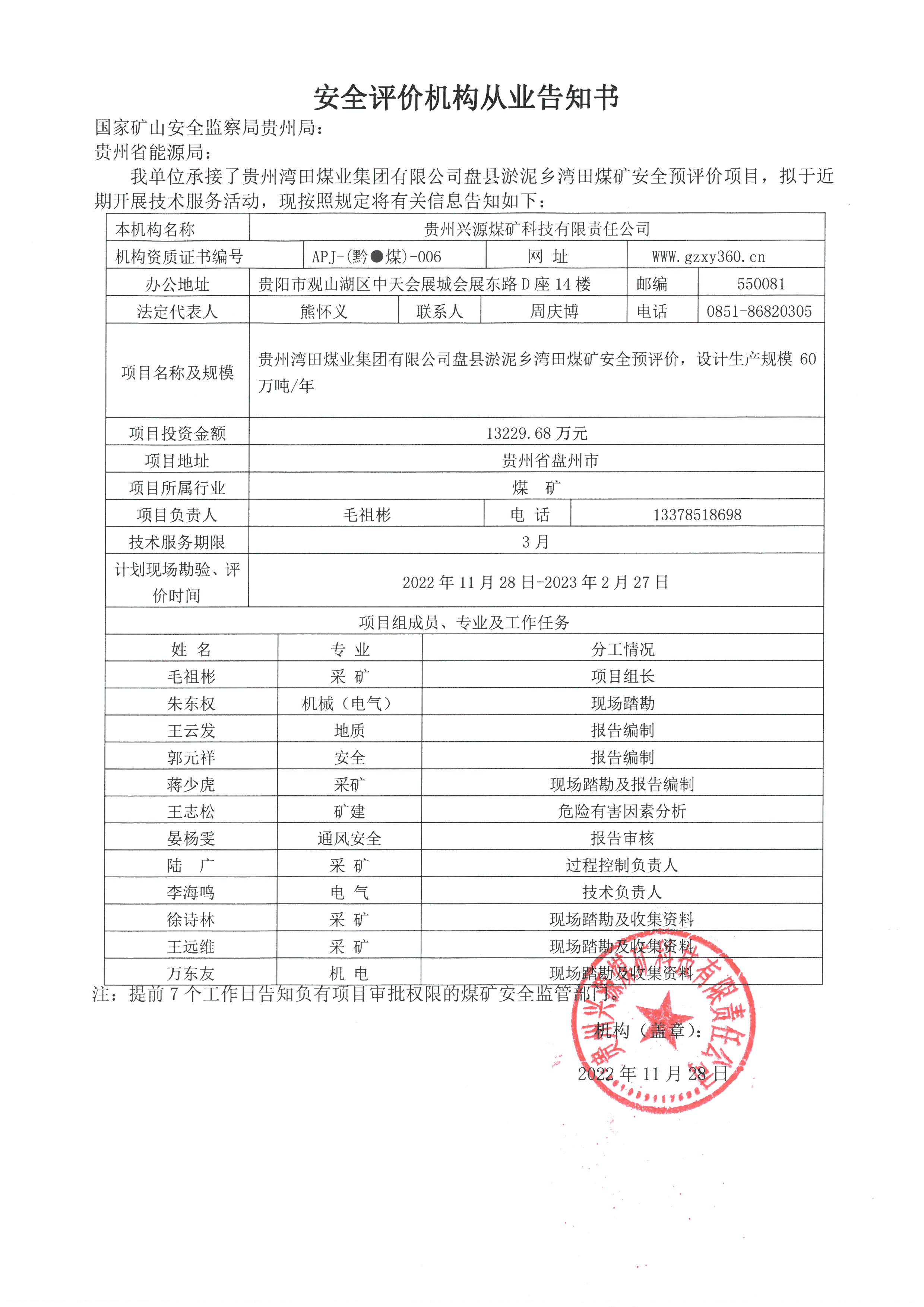 安全評價機構從業告知書【貴州灣田煤業集團有限公司盤縣淤泥鄉灣田煤礦】