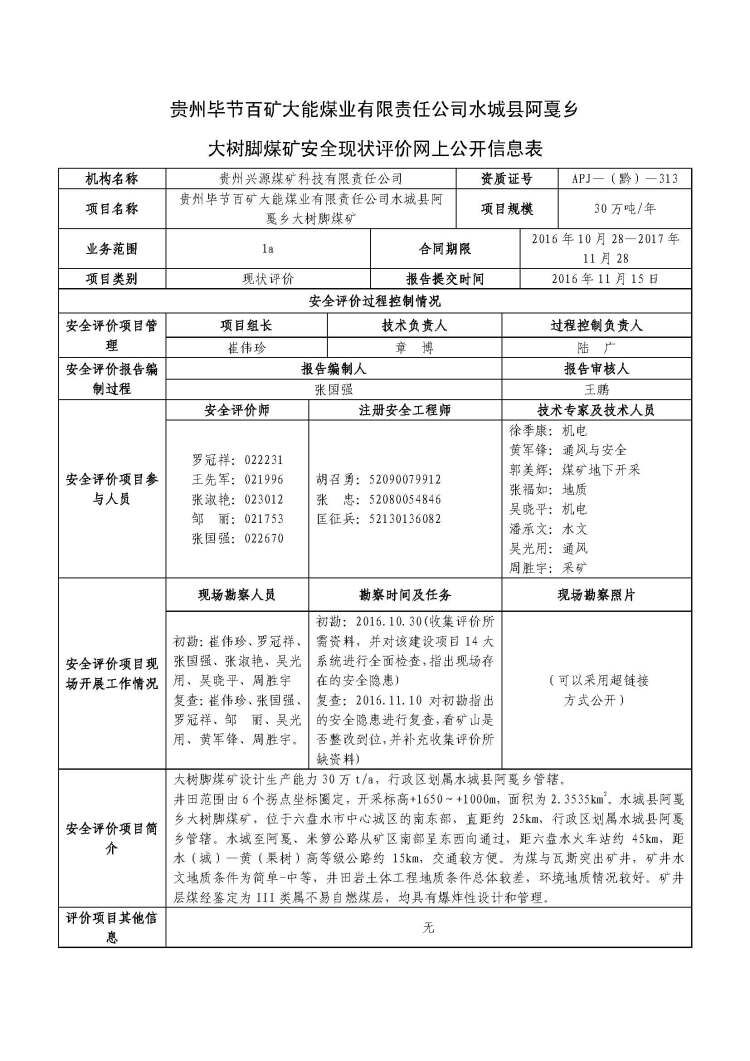 水城縣阿戛鄉大樹腳煤礦安全現狀評價網上公開信息表
