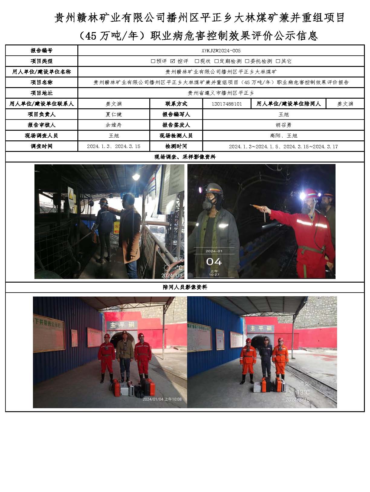 貴州贛林礦業有限公司播州區平正鄉大林煤礦兼并重組項目(45萬噸/年)職業病危害控制效果評價公示信息