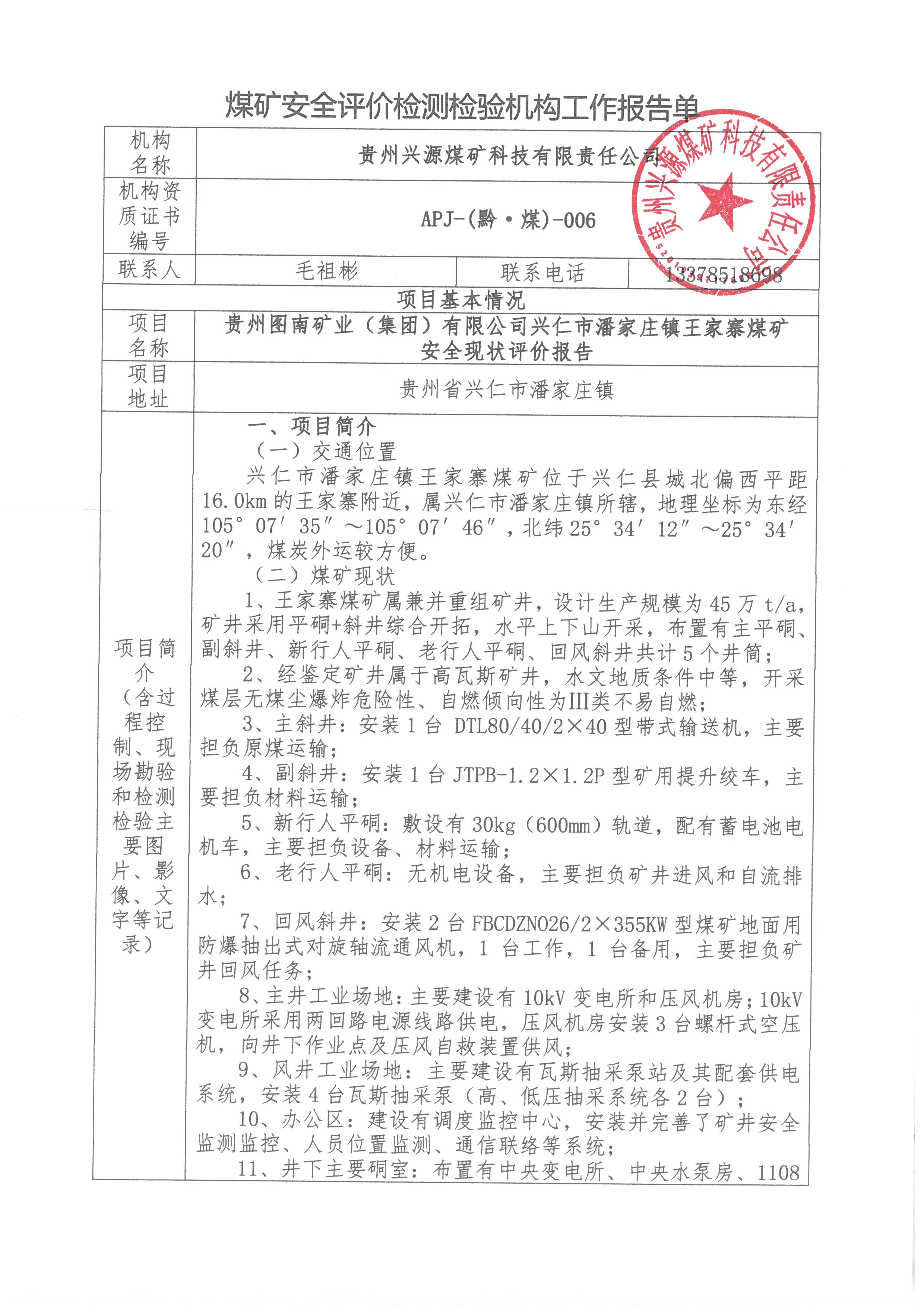 煤礦安全評價檢測檢驗機構工作報告單【貴州圖南礦業(集團)有限公司興仁市潘家莊鎮王家寨煤礦 安全現狀評價報告】