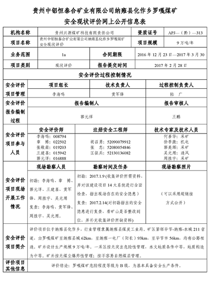 貴州中鋁恒泰合礦業有限公司納雍縣化作鄉羅嘎煤礦安全現狀評價網上公開信息表