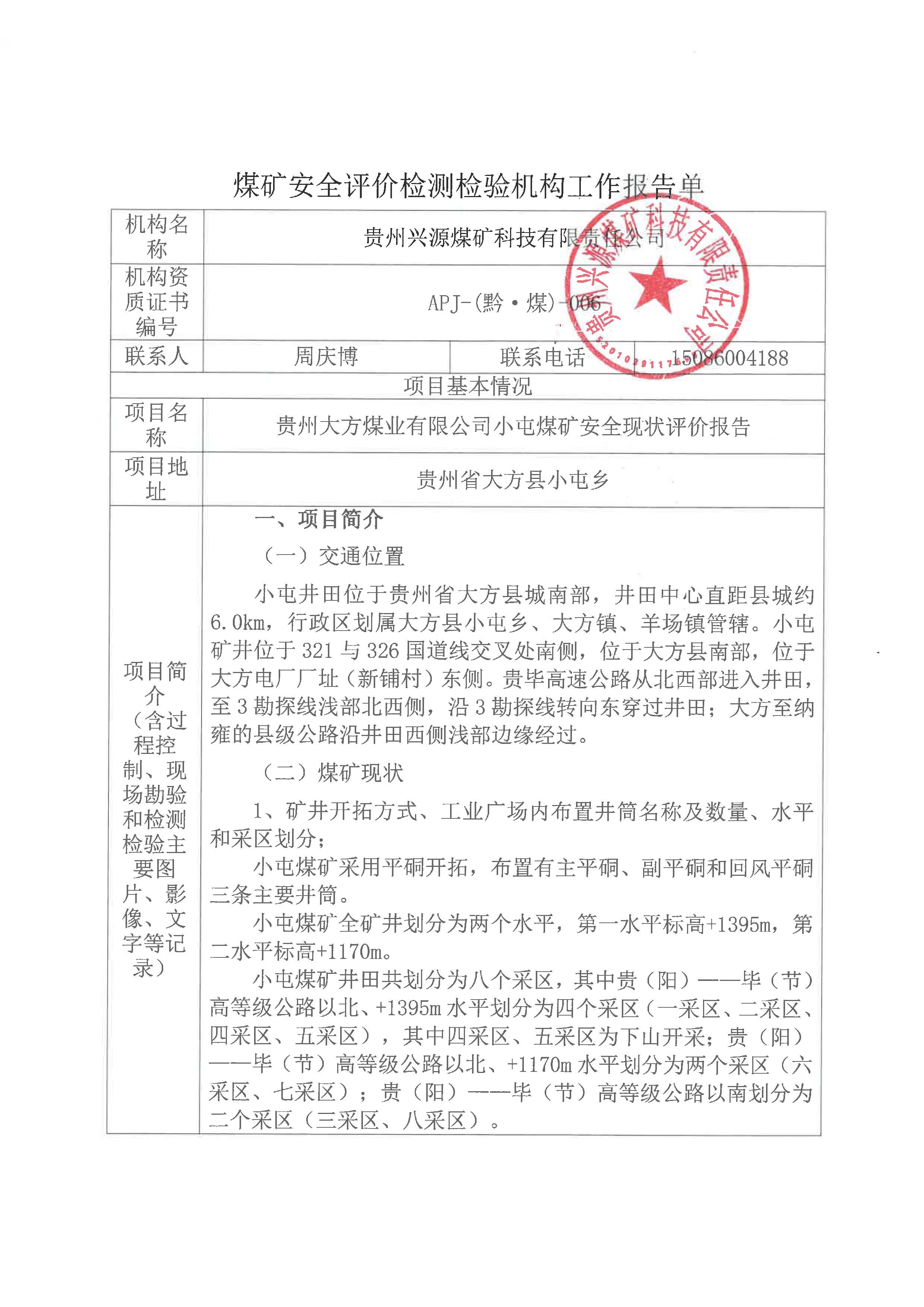 煤礦安全評價檢測檢驗機構工作報告單【貴州大方煤業有限公司小屯煤礦安全現狀評價報告】