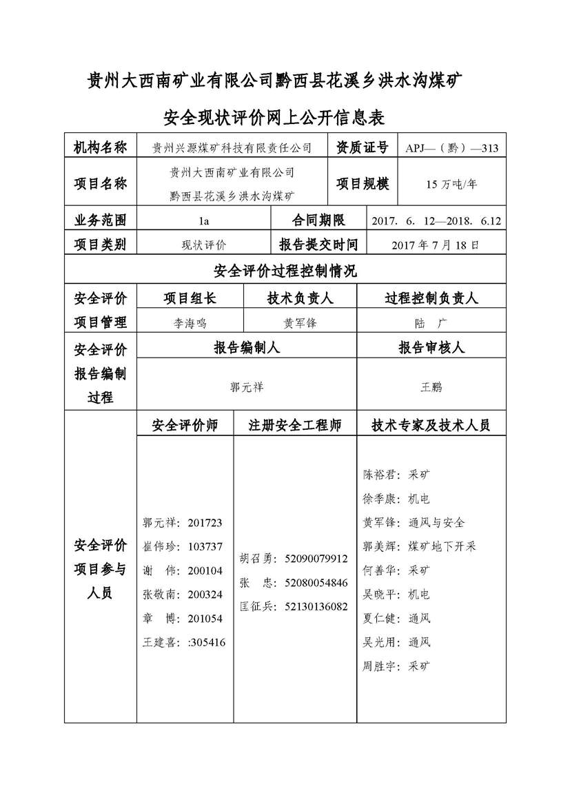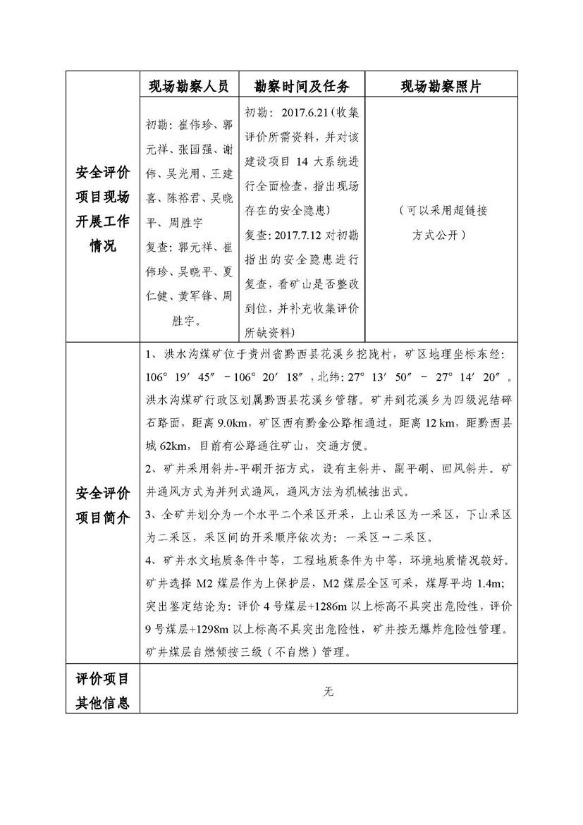 貴州大西南礦業有限公司黔西縣花溪鄉洪水溝煤礦安全現狀評價網上公開信息表