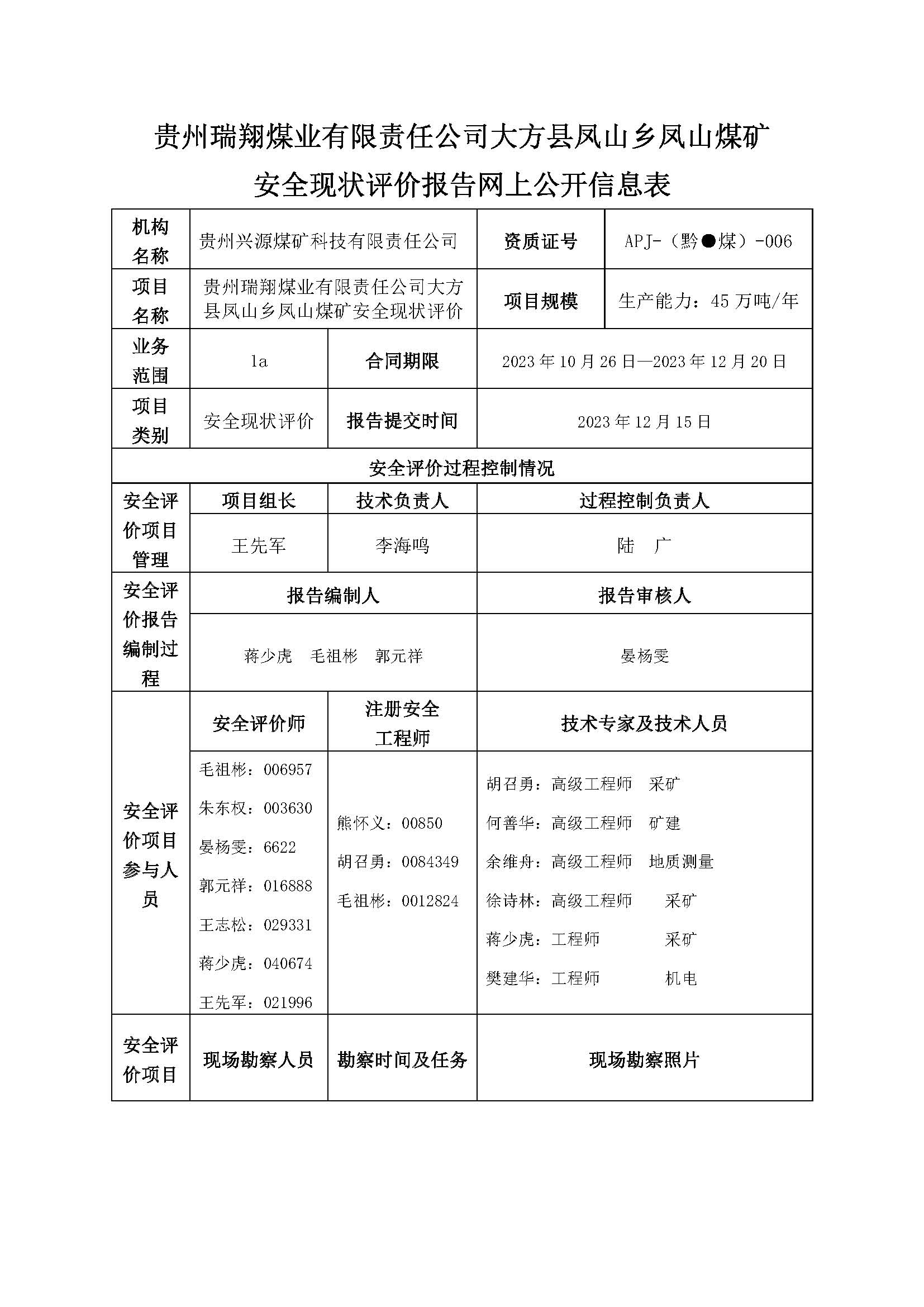 貴州瑞翔煤業有限責任公司大方縣鳳山鄉鳳山煤礦安全現狀評價報告網上公開信息表