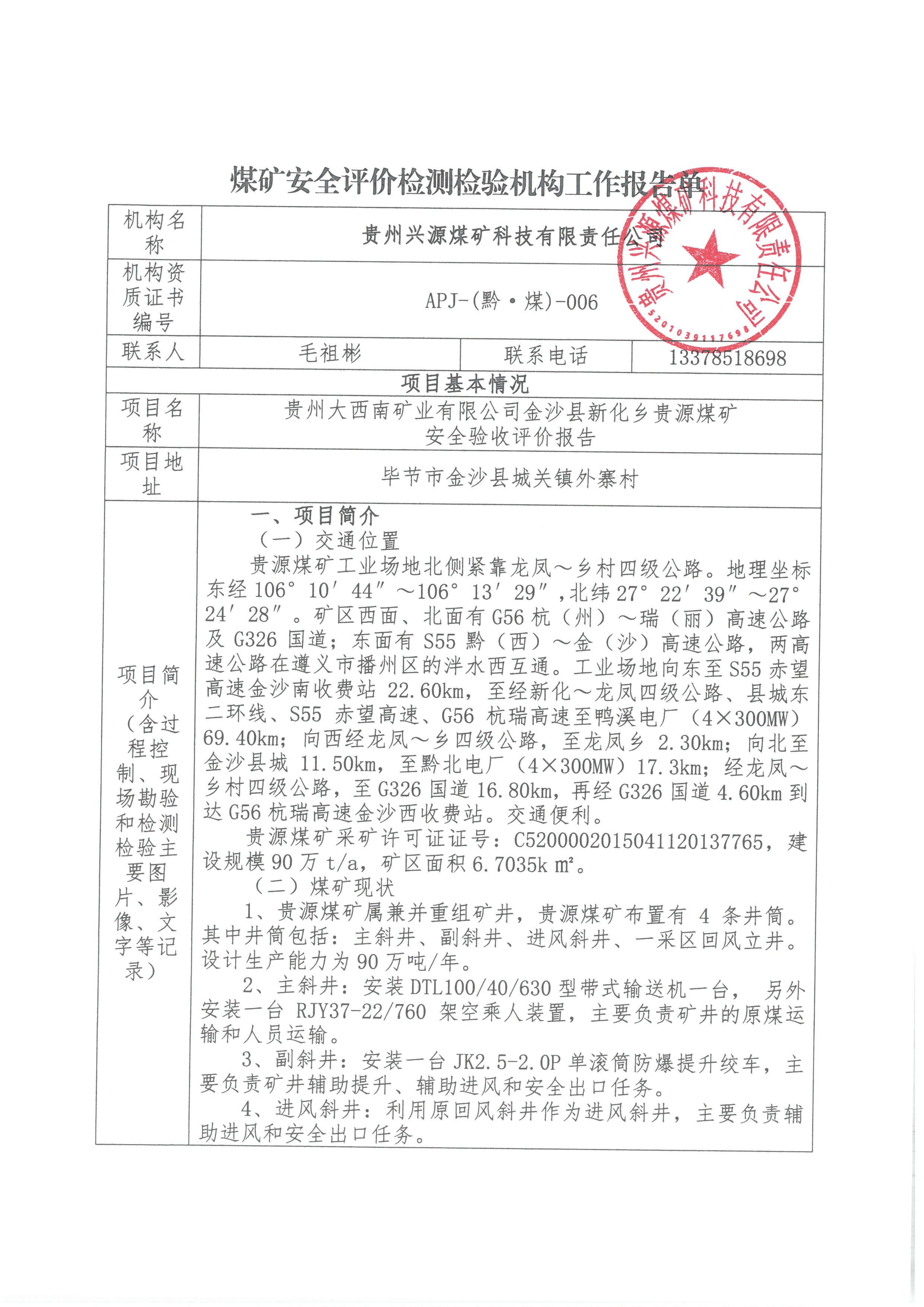 煤礦安全評價檢測檢驗機構工作報告單【貴州大西南礦業有限公司金沙縣新化鄉貴源煤礦 安全驗收評價報告】