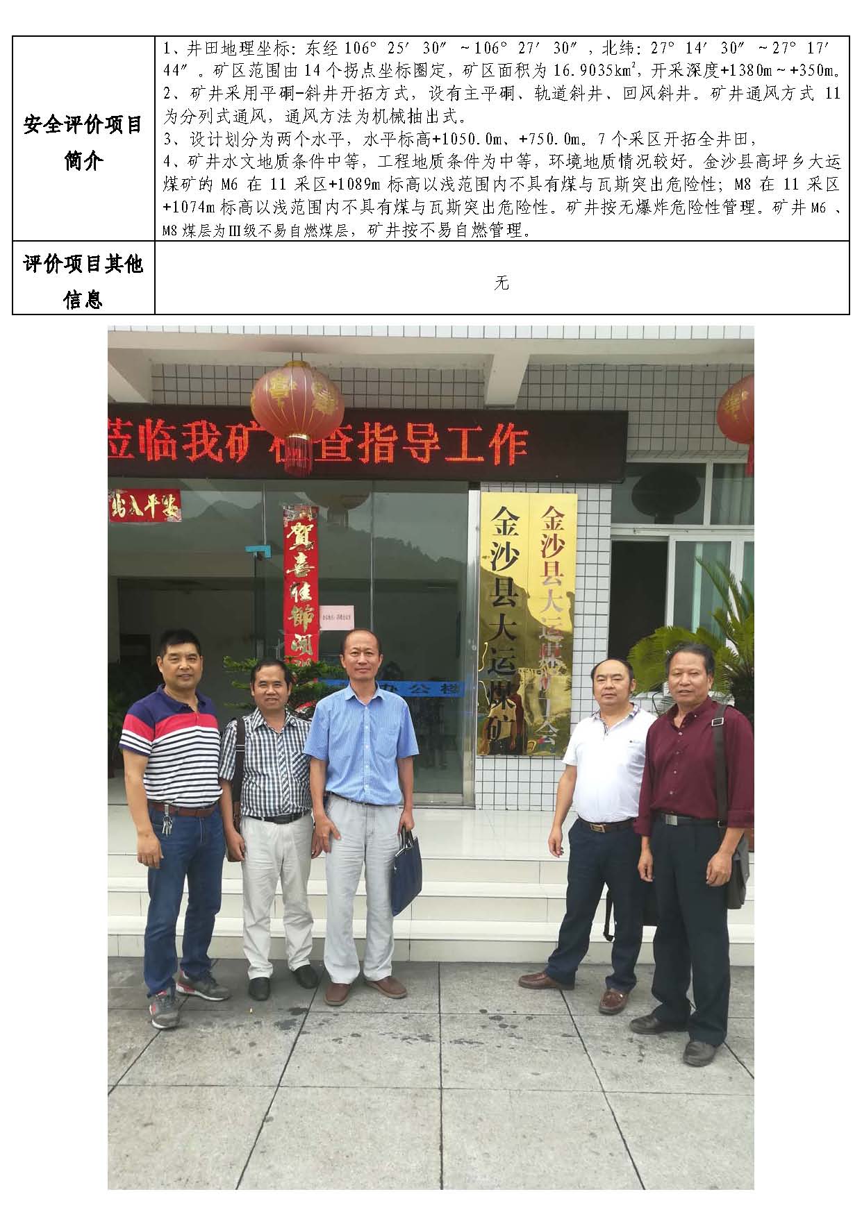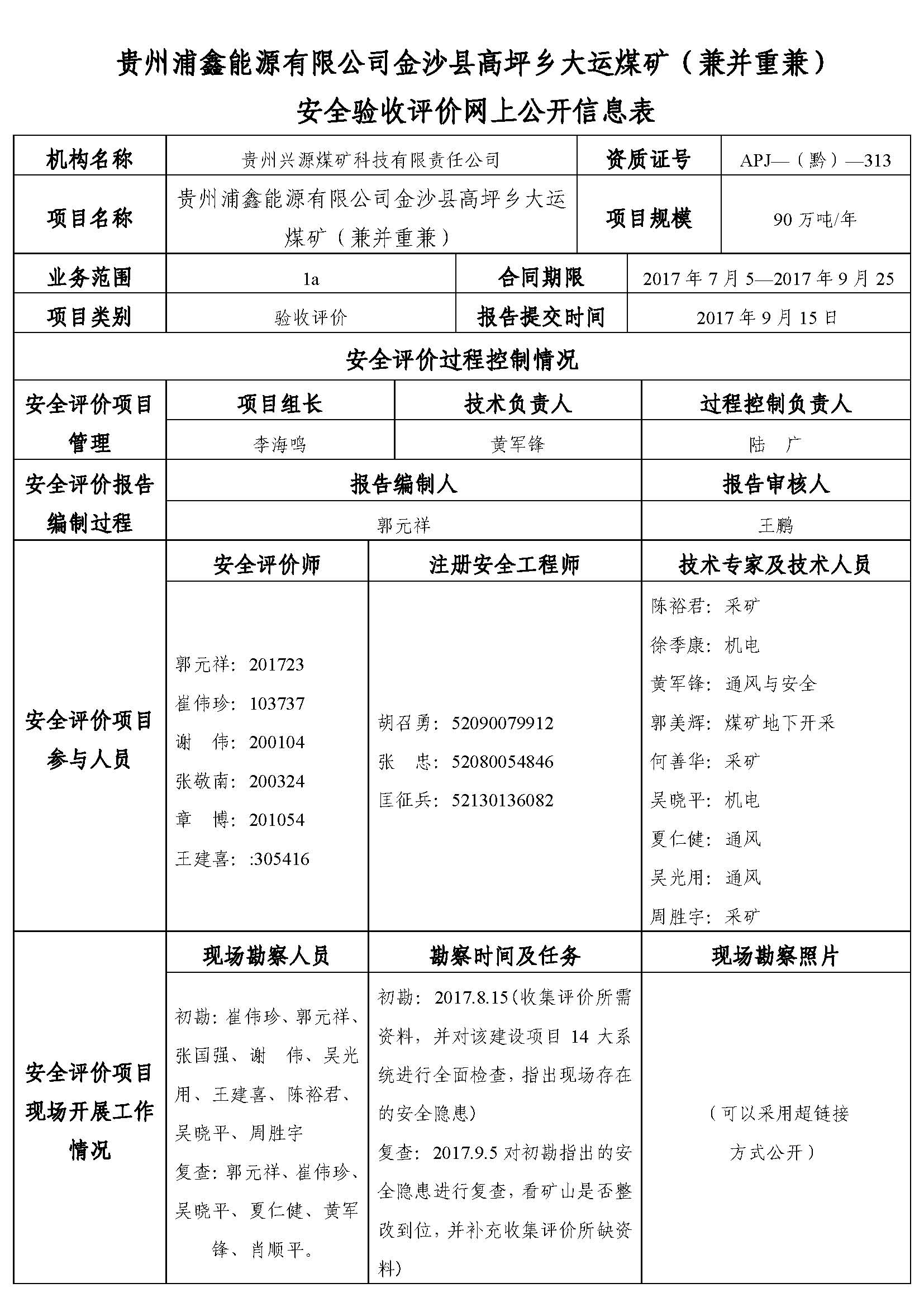 貴州浦鑫能源有限公司金沙縣高坪鄉大運煤礦(兼并重兼)安全驗收評價網上公開信息表