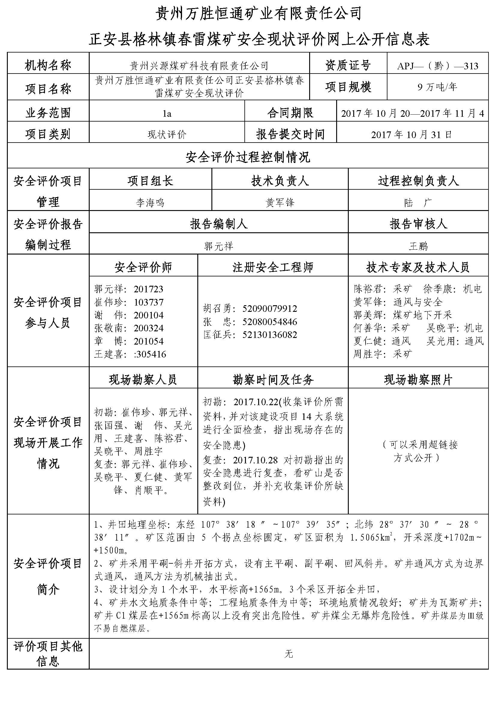 貴州萬勝恒通礦業(yè)有限責任公司正安縣格林鎮(zhèn)春雷煤礦安全現(xiàn)狀評價網(wǎng)上公開信息表