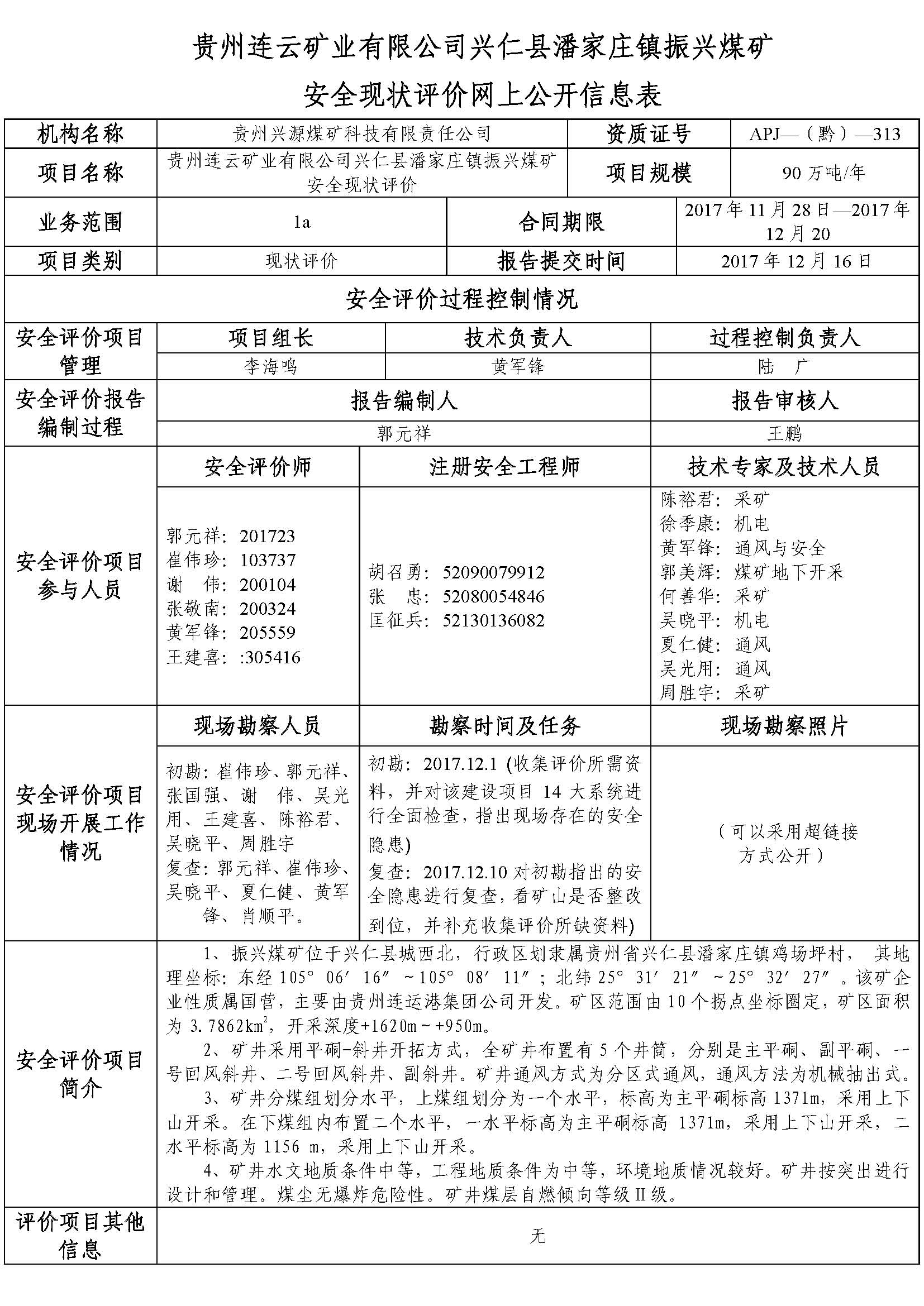 貴州連云礦業有限公司興仁縣潘家莊鎮振興煤礦安全現狀評價網上公開信息表