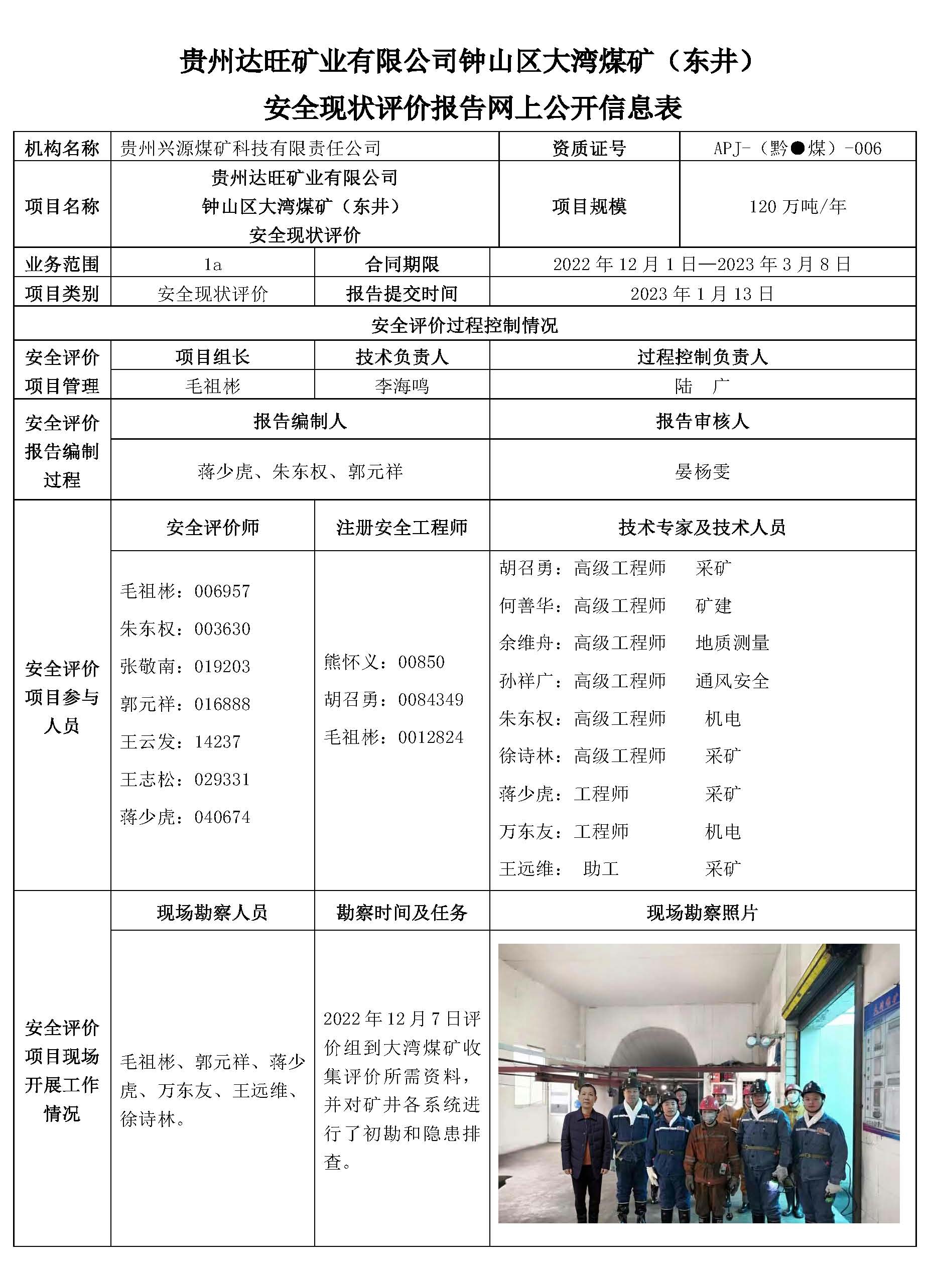 貴州達旺礦業有限公司鐘山區大灣煤礦(東井)安全現狀評價報告網上公開信息表