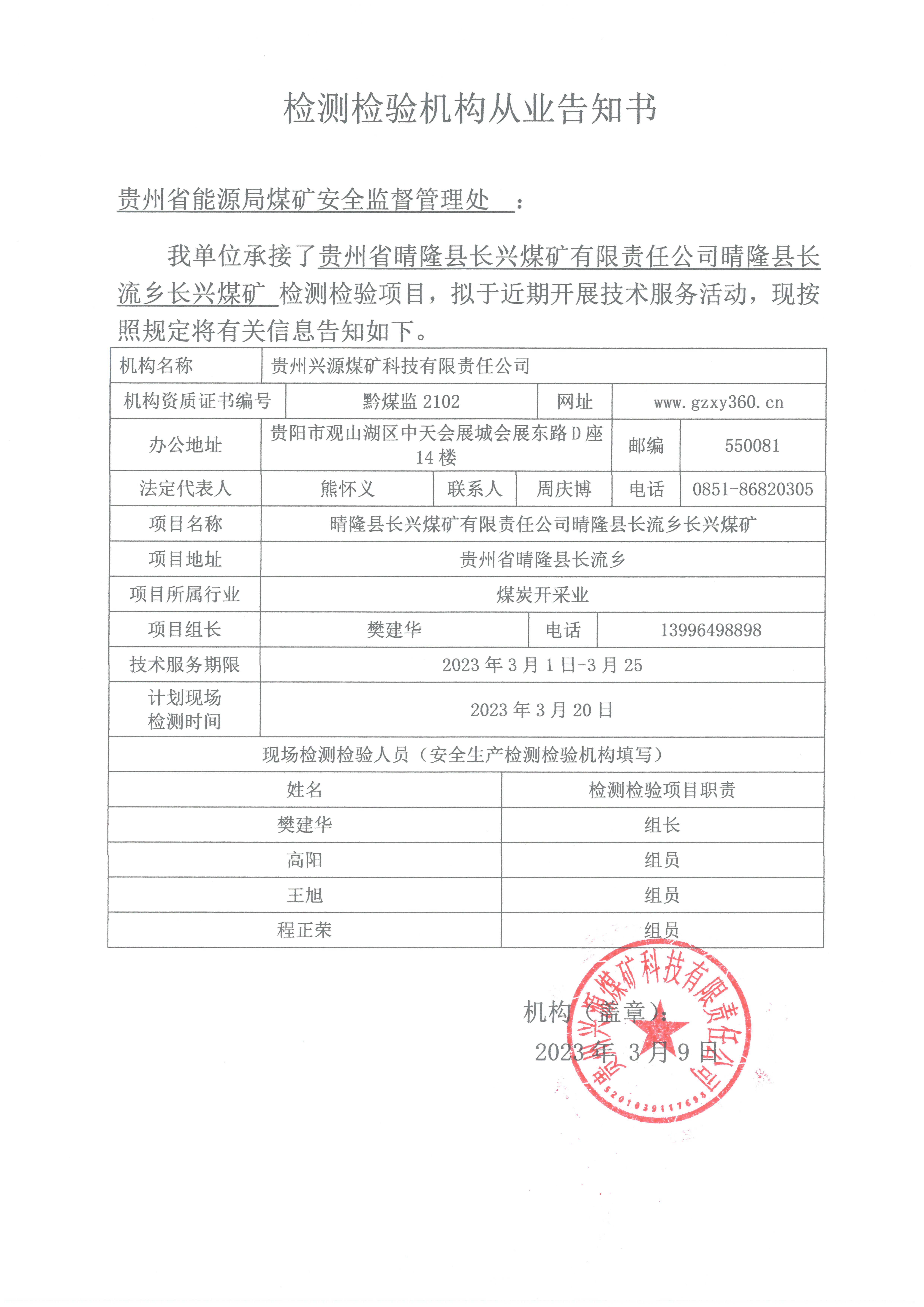 檢測檢驗機構從業告知書【貴州省晴隆縣長興煤礦有限責任公司晴隆縣長流鄉長興煤礦】