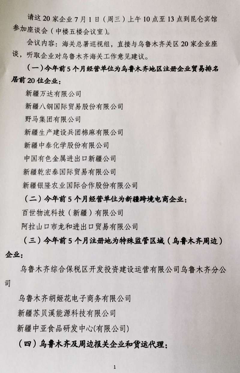 2020年7月1日上午10點-13點,假新疆昆侖賓館中樓五樓會議室,海關總署黨委第九巡視組召開了巡視烏魯木齊海關后的第一次關企座談會。今年前五個月經(jīng)營單位為烏魯木齊地區(qū)注冊且企業(yè)貿(mào)易排名居前20位之內(nèi)的企業(yè)、今年前五個月經(jīng)營單位為新疆的跨境電商企業(yè)、今年前五個月注冊地為特殊監(jiān)管區(qū)域(烏魯木齊周邊)的企業(yè)、烏魯木齊周邊保管企業(yè)和貨運代理企業(yè),共二十家單位均派出代表參會。會上,各位代表就今年疫情影響及應對措施、面臨世界經(jīng)貿(mào)形勢持續(xù)走低壓力下的新疆企業(yè)如何走出困境、為促進企業(yè)發(fā)展、關企寫作與互動等方面積極踴躍發(fā)言,提出了很多好的建議與意見?偸鹧惨暯M成員將上述給位代表提出的中肯意見和建議一一記錄在案,表示將協(xié)調(diào)烏魯木齊海關進行充分溝通積極解決。